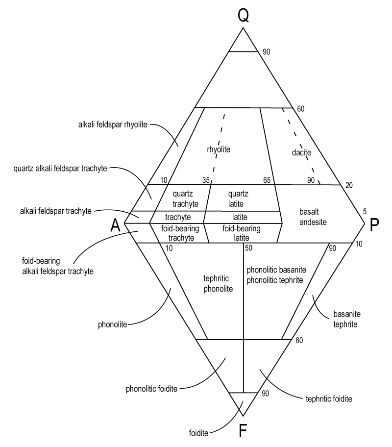 Riolite alcali-feldspatice | Riolite | Dacite | Dacite | Andezite | Bazalte | Trahite alcali-feldspatice | Trahite | Fonolite |